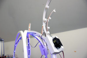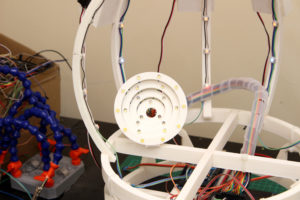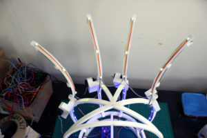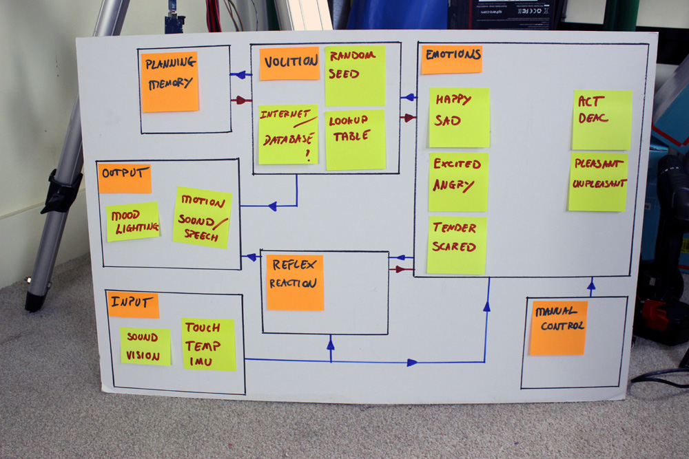I’ve added a Parallax EMIC2 text-to-speech module to the brain – the audio is processed with an effects processor and sent to the robot with a Bluetooth audio transmitter. I’ve also added an LED array which shows when touch or vision sensors are triggered.