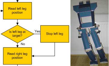 The flow chart above only lays out the process for leaning side-to-side but not actually walking. Once it can dynamically shift it’s weight then I’ll be adding some ‘trigger’ outputs to the main picaxe microcontroller which will in turn set off independant program loops on two other picaxes, one to control each set of leg motors to make them move to the correct positions at the correct time during the main loop from the flow chart above. This should make it locomote… small steps to start with though.
