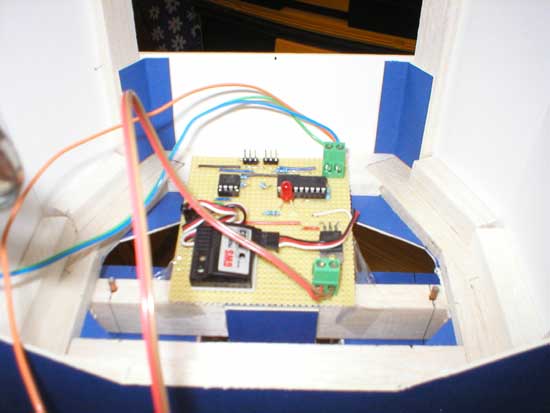 The board with two picaxes on. A Picaxe-08M generates a ‘centre’ servo signal signal which is fed into the gyro. The another picaxe-18 reads the pulse width of the signal on one of it’s inputs. At the moment it lights an LED for 200ms if the signal deviates outside contraints which are coded into it’s program. This board is built into the bottom of the body although I may move it higher up depending on how the testing goes: