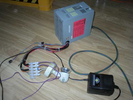 I’ve been testing with an old PC power supply which does 25A at 5V which is good for the motors, but sometimes it still trips out – don’t think it likes the spikey load… might try batteries next. I’m loading it with a lightbulb to make it turn on but it’s not the best arrangement really. I’ve also got another mains PSU to power the logic that’s seperate from the motor PSU: