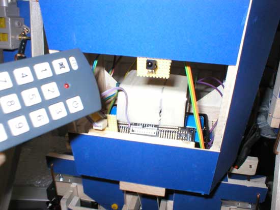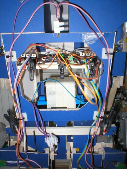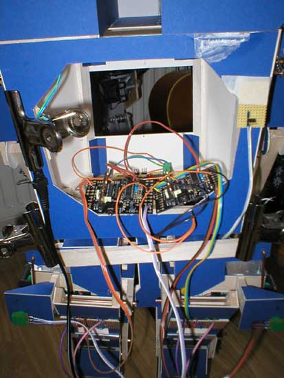 Here are the two Picaxe boards in the android along with the (green) pots that can be seen on each hip: