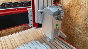 The spindle is a 2.2KW three-phase unit with it’s own driver box so it’ll operate from single-phase 230v. It’s RPM can be controlled from Mach3 – check out the video above.