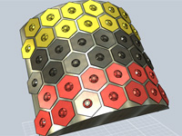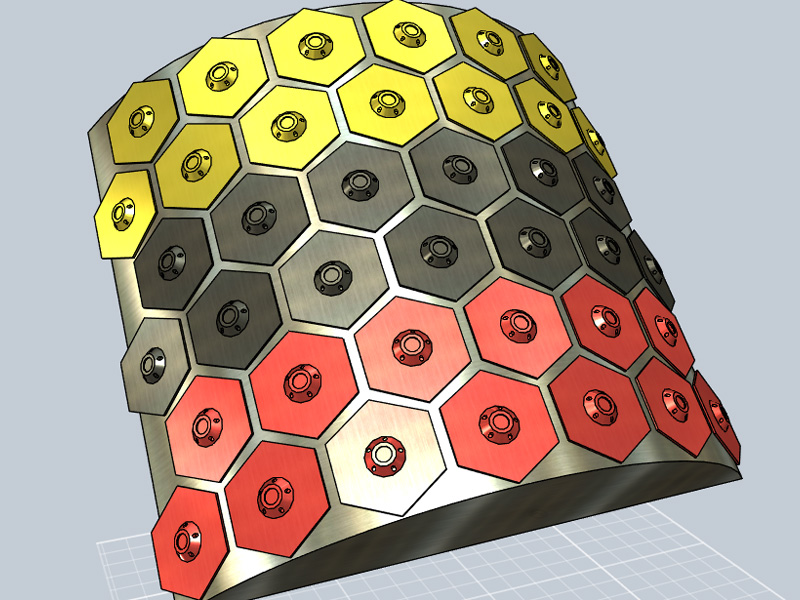 The suit is going to probably end up at least twice as wide as a normal person/Iron Man suit, with over-sized arms. Therefore there will potentially be lots of large expanses of material which make up the body panels. To be sure that the suit is still highly detailed I’ve been experimenting with some surface textures which you can see below. Something similar to these will probably cover the outer arms/legs/should bells, with other textures for the torso. This will also enable parts of the surface to open/close.