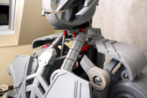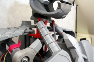 The neck sections consist of levers to move the head around which are attached to servos. This allows pan tilt and yaw for the head assembly. The conduits either side of the head are flexible and also have actual cables channels in so I can get wiring to the head:
