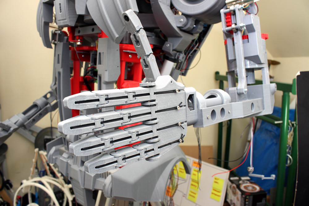 There are quite a few 3D printed hand projects around already, including the Open Hand Project and the Enable Project, however I decided that I would design my own hands. I made a guide channel in the top of the hand so that I could string the fingers back with elastic cord, and use a pull-string on inside of each finger to bend the fingers. I decided to replace the previous forearms which used servo driven motor mixing and just one servo.motor per axis. The hands will rotate and grip, but that’s about it.